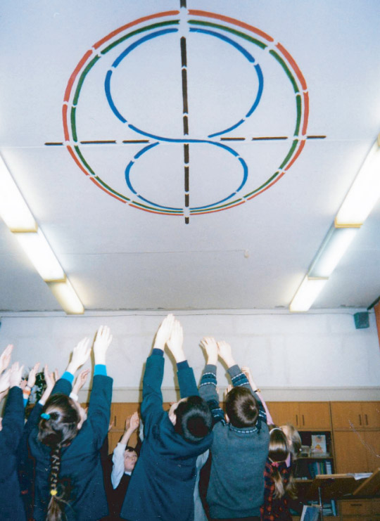 Способ нанесения и размеры схемы на потолке в каждом случае определяется индивидуально с учётом разных размеров учебных комнат и расположения на потолке светильников. При этом желательно предварительно проконсультироваться с сотрудниками нашей организации. Исследования выявили: наибольшую эффективность несёт в себе «СУС» если он изображён на потолке в максимально возможных размерах.